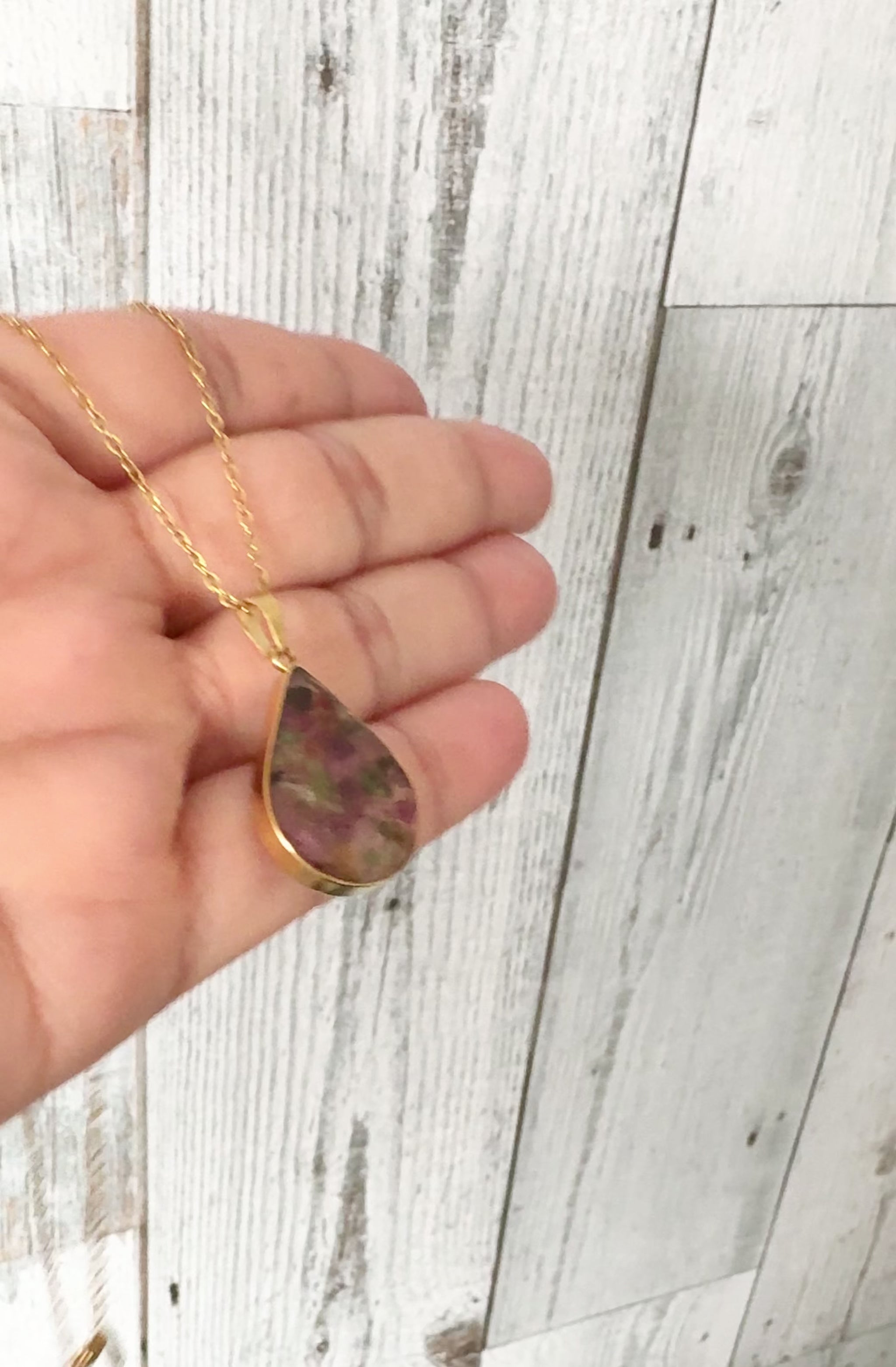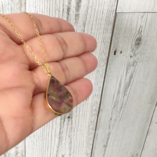 The teardrop pendant is framed with a gold-tone edge and paired with a delicate gold chain, creating a refined yet eye-catching piece suitable for everyday wear or special occasions.