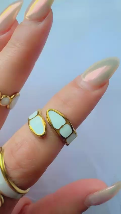 Add a touch of elegance with this gold shell inlay band ring, featuring a wide design with smooth white shell-like inlay framed in polished gold. The glossy, pearl-like finish gives it a refined and timeless appeal, making it the perfect accessory for both casual and dressy outfits.