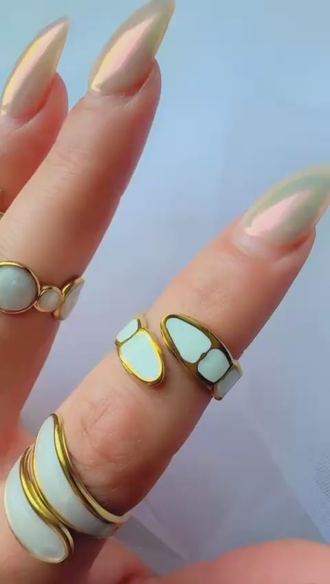 Bring ocean-inspired elegance to your style with this gold triple shell inlay ring, featuring three smooth shell-like stones set in polished gold. The glossy, pearl-like finish makes it both eye-catching and versatile — perfect for everyday wear or special occasions.