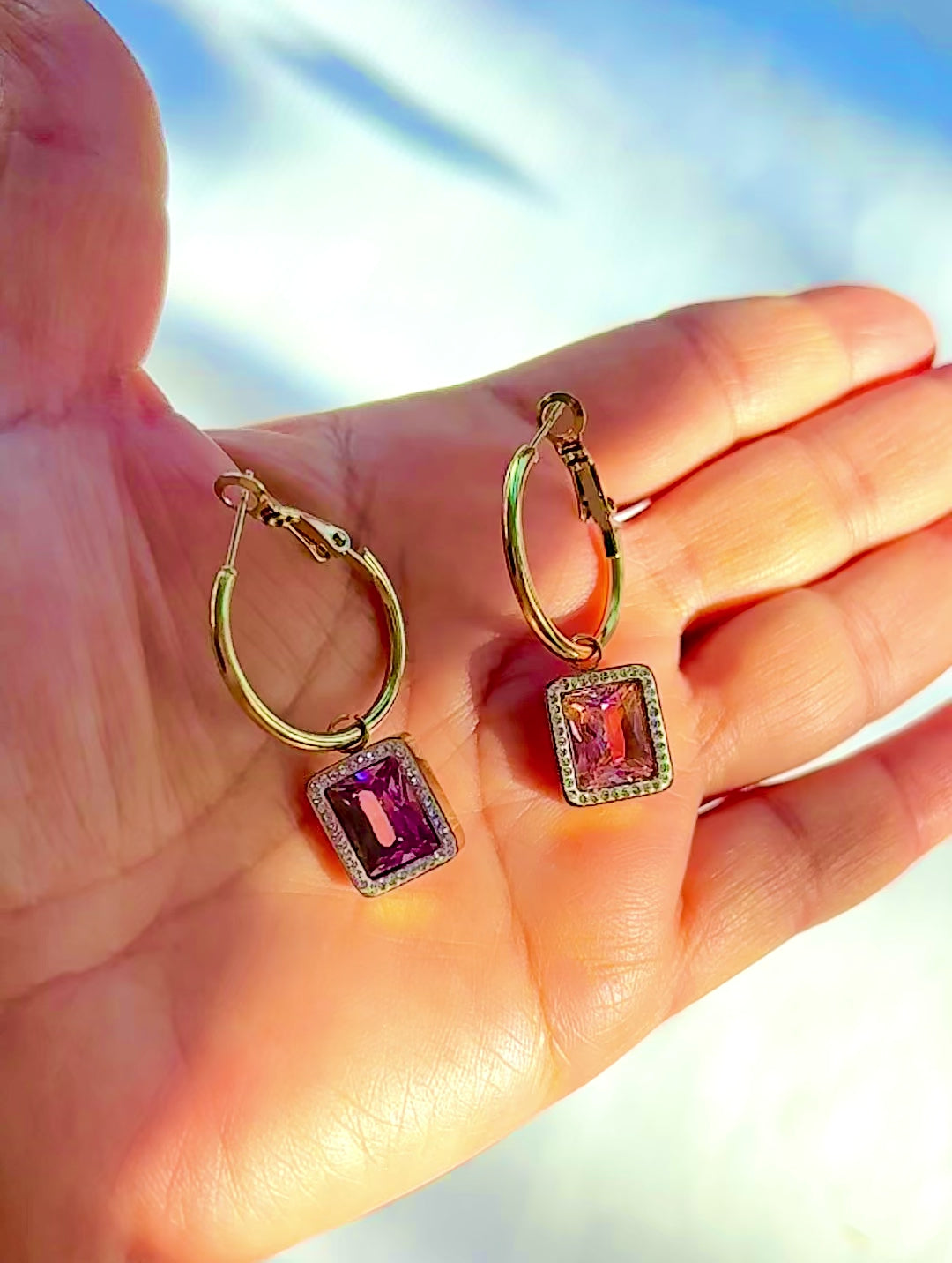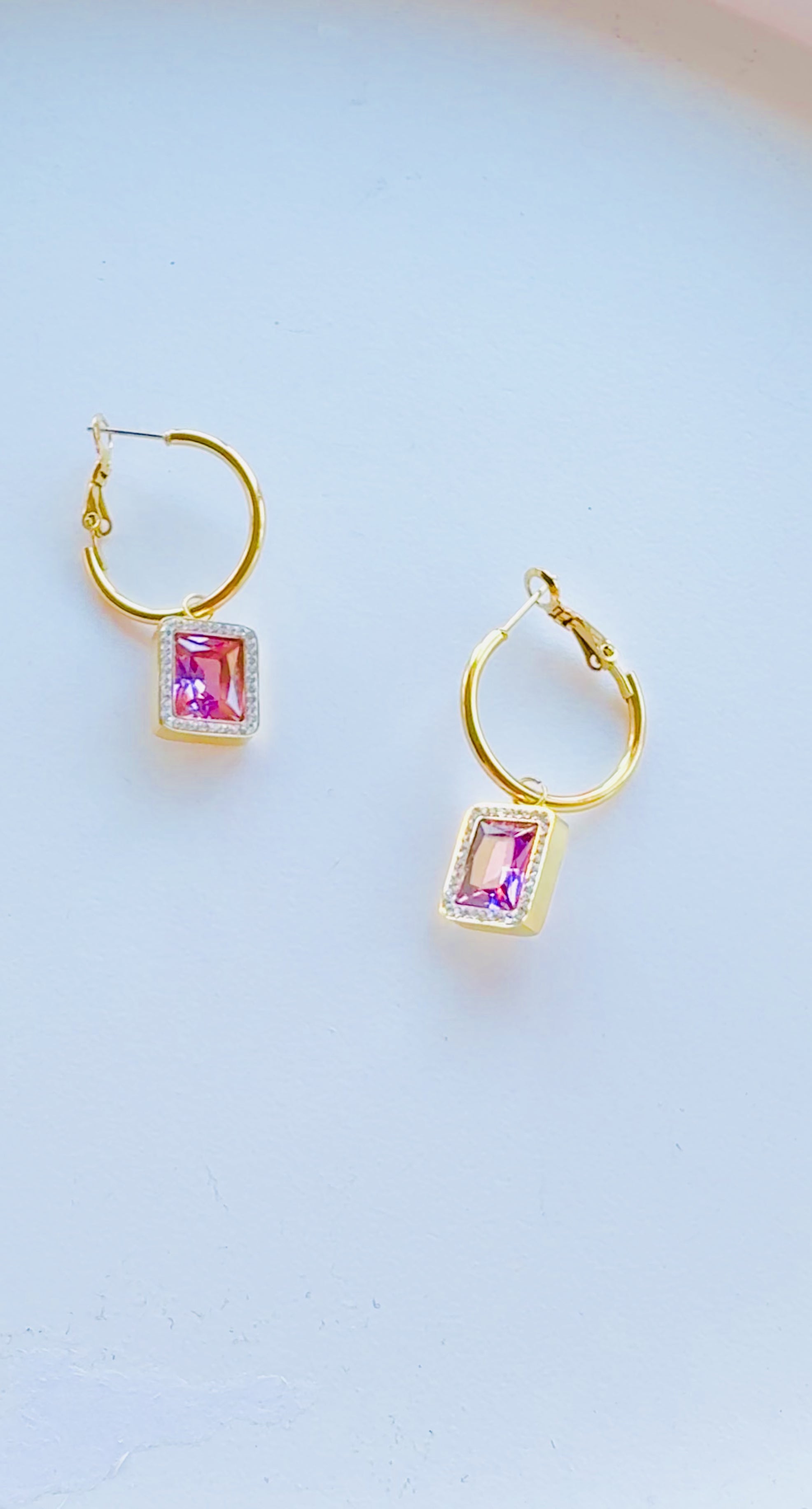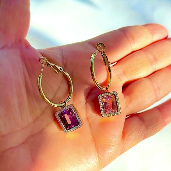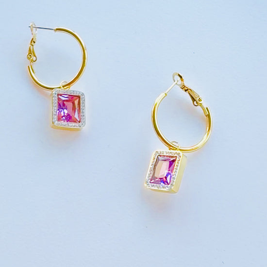 Pink Gemstone Drop Hoop Earrings – 18K Gold Plated Non-Tarnish Stainless Steel