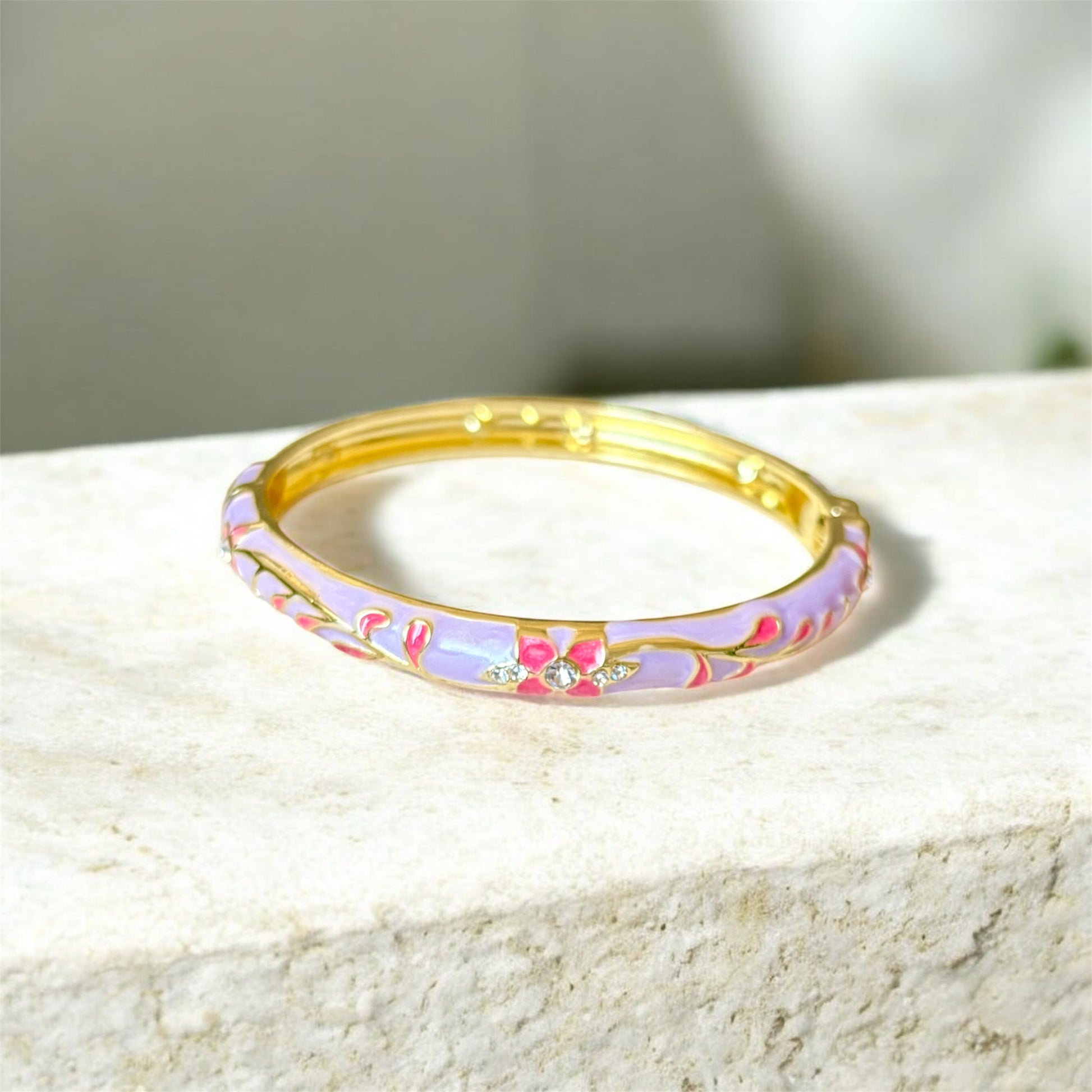 Purple Blossom Enamel Gold Bangle – 18K Gold Plated, Floral Design, Non-Tarnish, Easy Spring Hinge