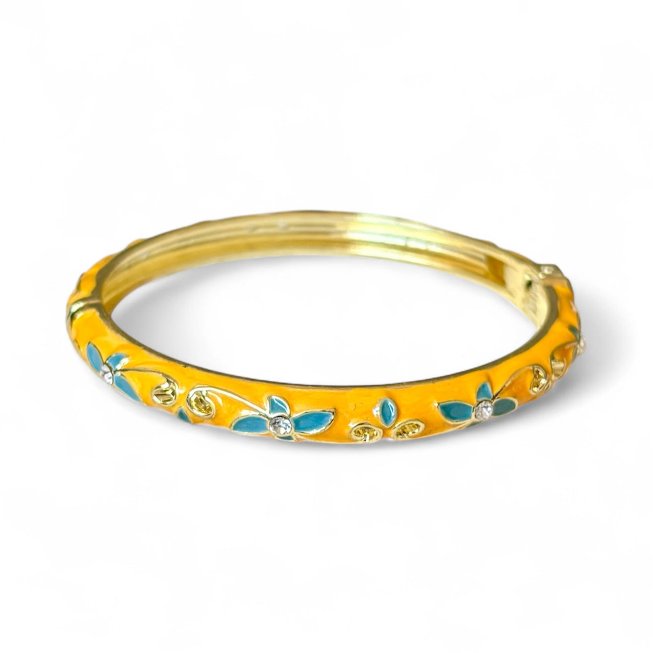 Yellow Enamel Gold Bangle – 18K Gold Plated, Floral Design, Non-Tarnish, Spring Hinge